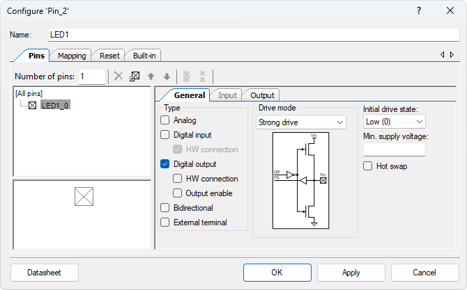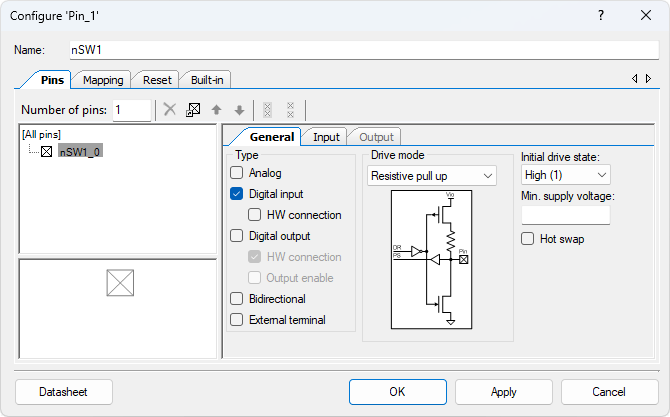 - Set the Drive Mode to Resistive pull-up, which ensures the pin defaults to high when not pressed.