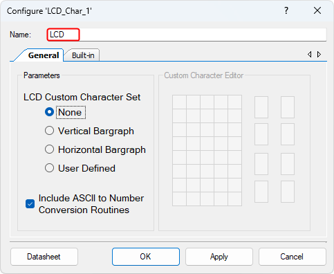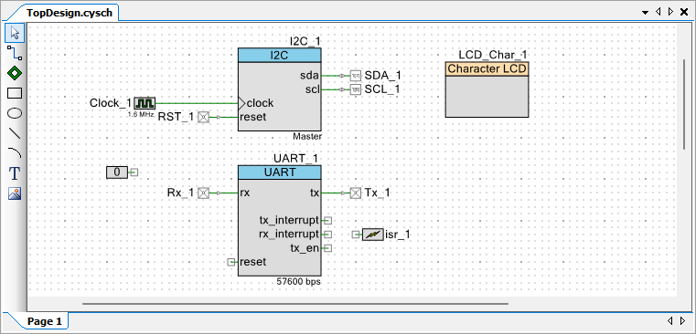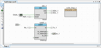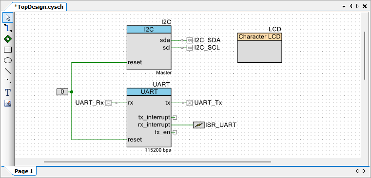 After completing these steps, the schematic will include all necessary components — UART, I2C Master, Interrupt, Character LCD, and Logic Low '0' — ready for configuration and connection in the next stage.