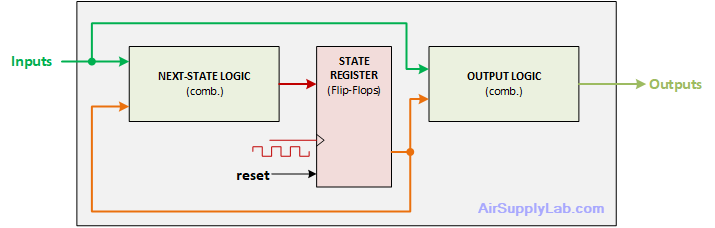 next_state. - Output Logic: logic that computes outputs (Moore or Mealy rules).