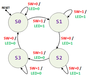 Transition Labels: Input/Output (e.g., SW=1 / LED=1)